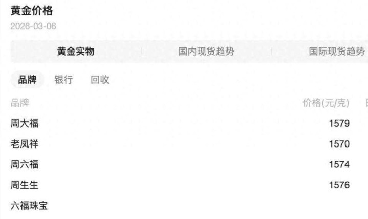 3月6号下昼,杭州大厦周大福门口有东谈主列队,他们不是来抢购,而是来问价,伙计提到20号前后还得加价,推测幅度在15%到30%,当今算是廉价位,老铺黄金在2月底先动了手,足金饰品奏凯涨了两到三成,其他品牌也随着革新,就像推倒了第一块多米诺骨牌,我站在柜台前看大屏幕,足金饰品标价1579元一克,金条才1385元,差了快200块钱,这个价差不是一天拉开的。
