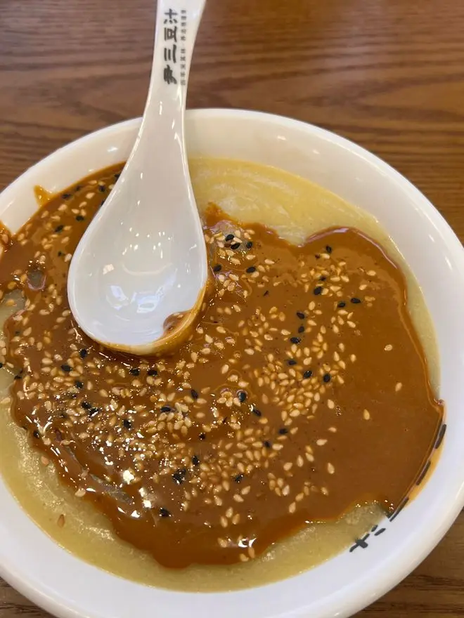 糜子面熬成糊状,双层麻酱配椒盐的"太极图案"是圭臬技法。大兴巷子的面茶名家坚合手用石磨研磨芝麻,使酱料保留细微颗粒感。老一辈认真"无谓勺、转着碗喝",为的是每一口都能尝到糜子香与麻酱咸的渐变脉络。