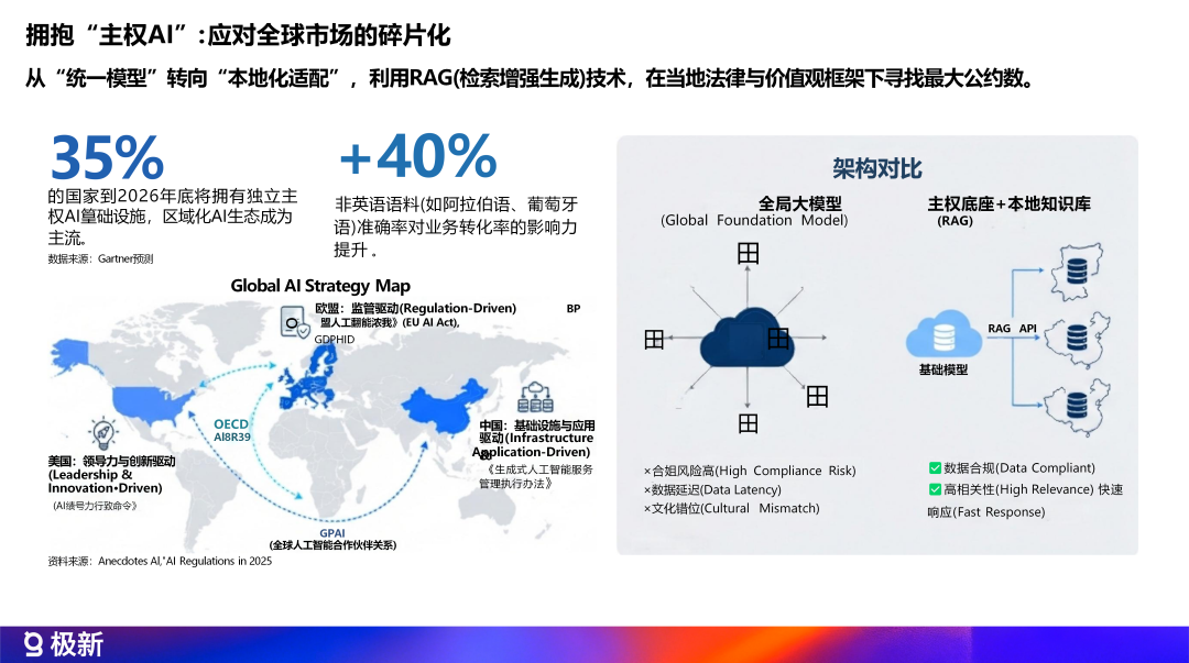 35%的国度到2026年底将领有自强派别的AI寄出本事,区域化AI生态将成为主流。何况,非英语语料准确梗径直影响40%的蜿蜒率。这推着出海企业采选RAG时候,让AI“像土产货东说念主通常想考”。