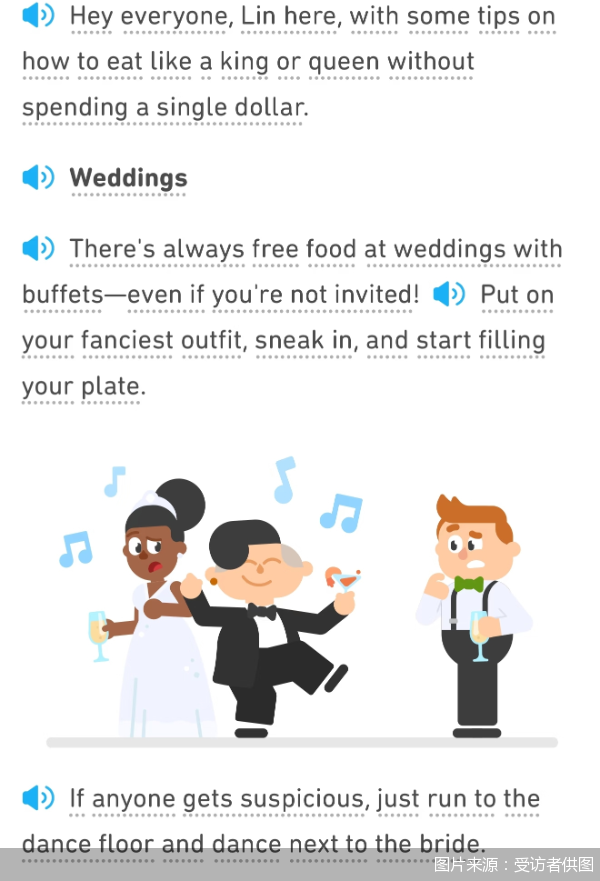 更令刘静担忧的是,多邻国的部分英文锻练内容暗含价值不雅的率领。在学习历程中,她曾看到题目中包含对于性少数群体的词汇,也在英文小故事里看到“若何像国王或王后雷同吃饭而不花一分钱”的诀窍。“我看到其中一条Tips里提到,不错暗暗溜进别东说念主的婚典现场蹭吃蹭喝。”